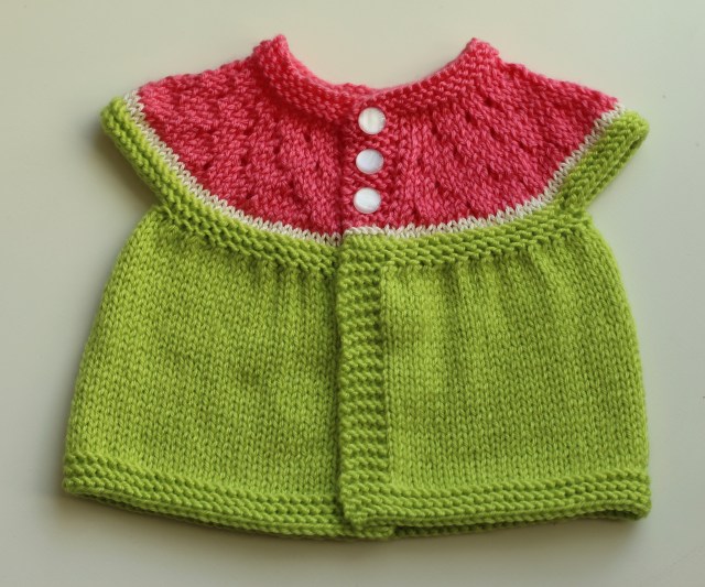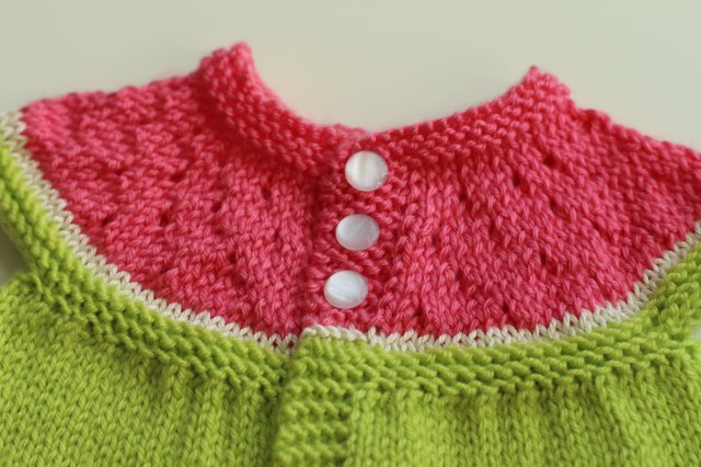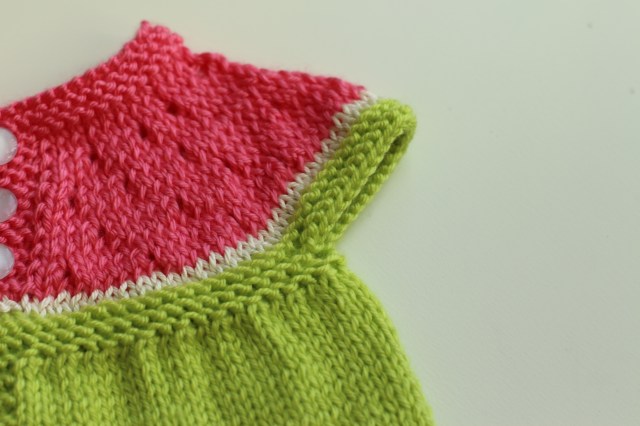 The shaping at the top is achieved by using yarn over to create eyelets (to mimic the seeds of a watermelon)/extra stitches, and then casting off stitches to create the armholes: