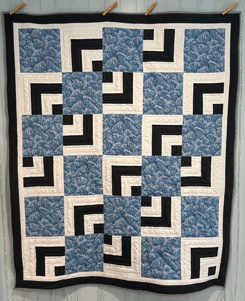 I had only planned to try to make two quilts for the Comfort Cases Quilt Donation Drive but there was this fabric that kept speaking to me from the shelves at Michael’s and ya girl can only resist temptation for so long. So I bought some, and chose this pattern to nicely showcase it, it’s one of the Fabric Cafe 3 yard quilt line, so just uses one yard each of 3 fabrics to make a 46 x 54″ quilt. The other fabric I used to make up the detail blocks was just Kona cotton in white and gotham grey.