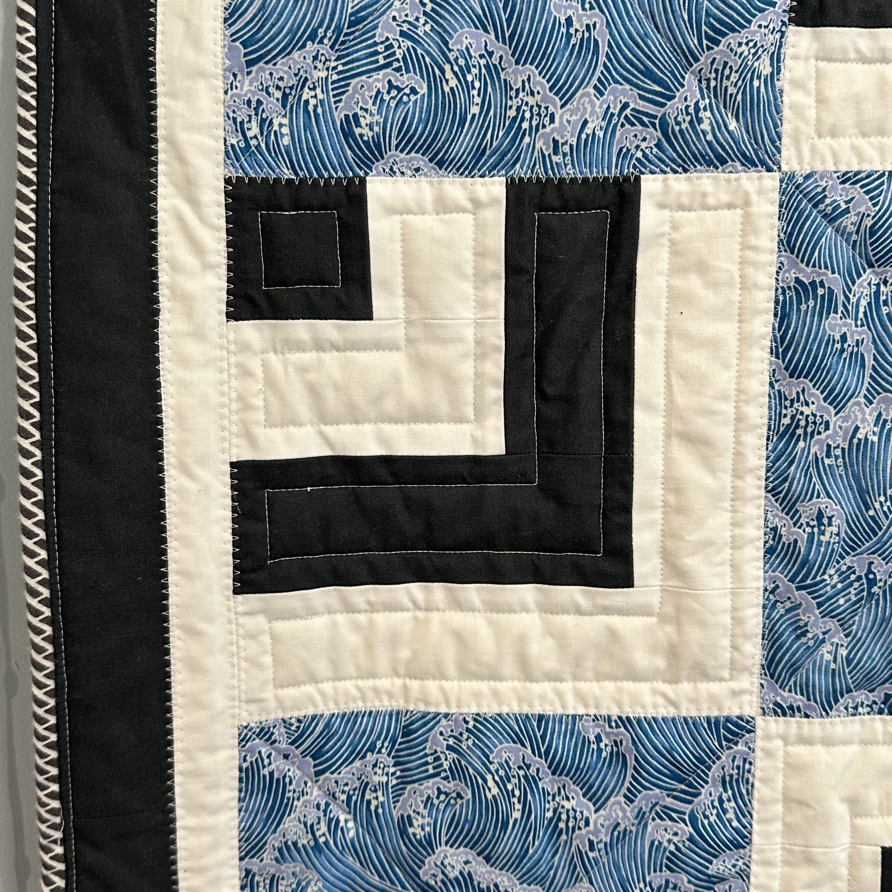 I didn’t trim them before piecing together the quilt top though, which was perhaps an error, as some of the seam allowances ended up a little… scant. Maybe 1/8″ instead of 1/4″, so in order to stabilize the seams I used a decorative stitch to quilt the seams between each block, and between the blocks and borders. I then also did a bit of straight line quilting to echo the detail on the blocks.